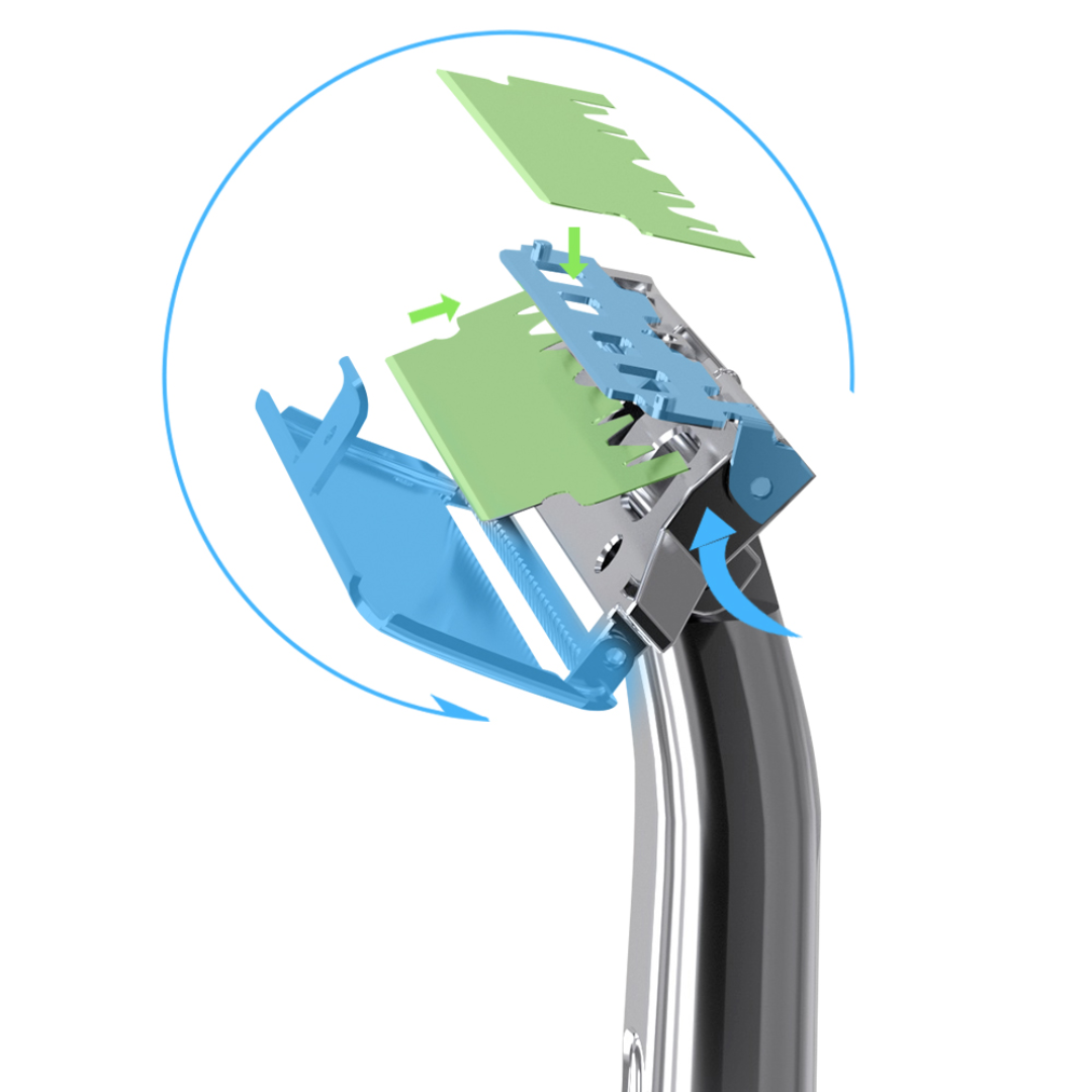 Nueva tecnología doble cuchilla, sólo debes partir la cuchilla minora en dos partes, con su sistema imantado es fácil y seguro de cambiarlas: